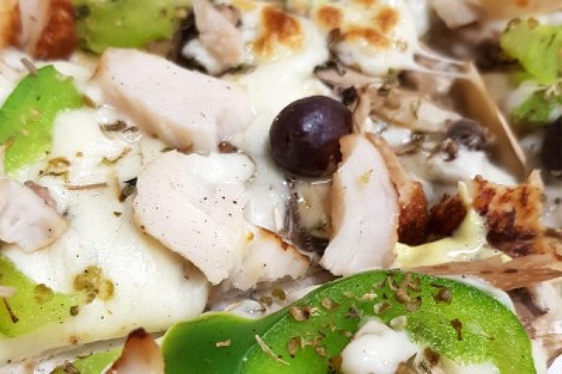 Base crème, sauce curry champignon frais, tranchettes de blanc de poulet, mozza 100%, poivrons frais