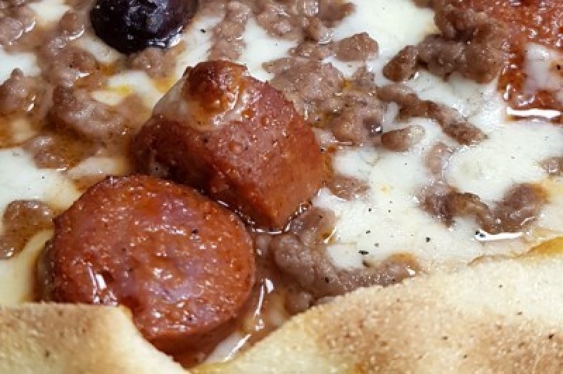 Base tomate, mozzarella moelleuse, viande hachée charal, merguez Bœuf hallal et crème