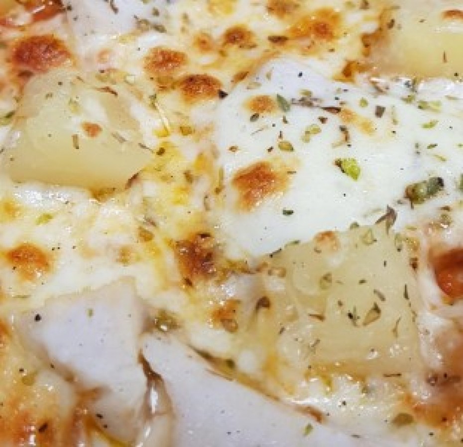 Base tomate, Ananas, mozzarella 100%, tranchette de filets de blanc de poulet et crème